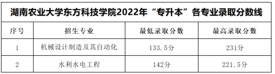 2022湖南农业大学东方科技学院专升本录取分数线