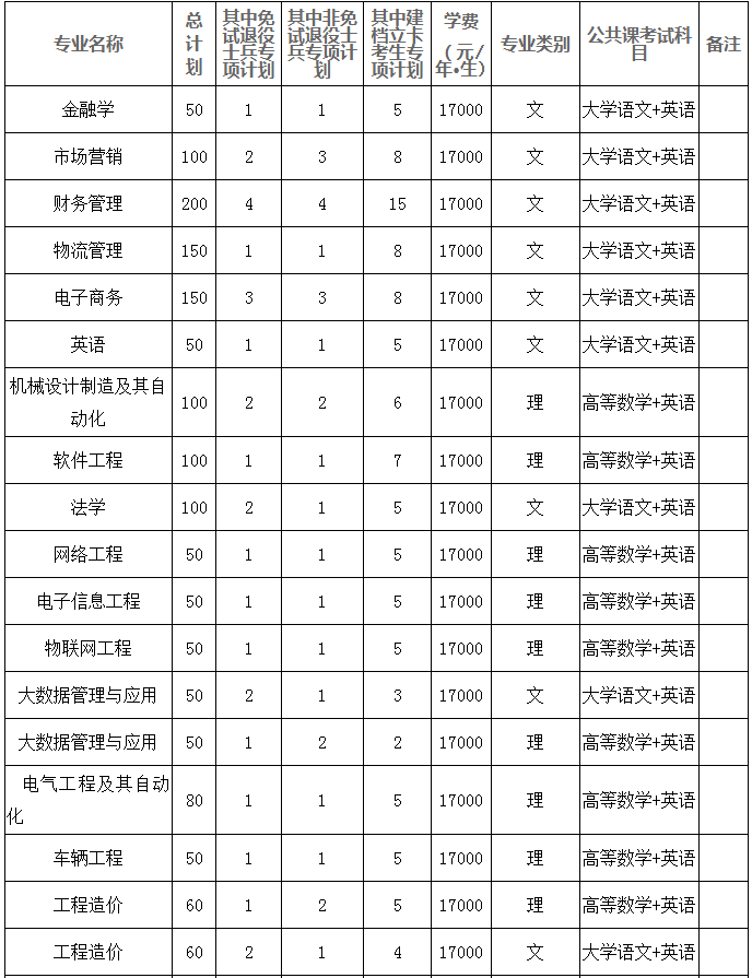 专业内计划优先按照专项计划的计划数录取,专项计划三类中如有未完成的空余计划,先进行三类专项相互间调整,专项计划相互间调整后如还有多余计划调整至专业内普通计划录取,专业内如普通计划生源不足导致的多余计划调整至专项计划录取。专业内计划调剂规则:未完成计划调出顺序和生源充足调入计划顺序均为免试退役士兵专项计划、非免试退役士兵专项计划、建档立卡考生专项计划、普通计划。