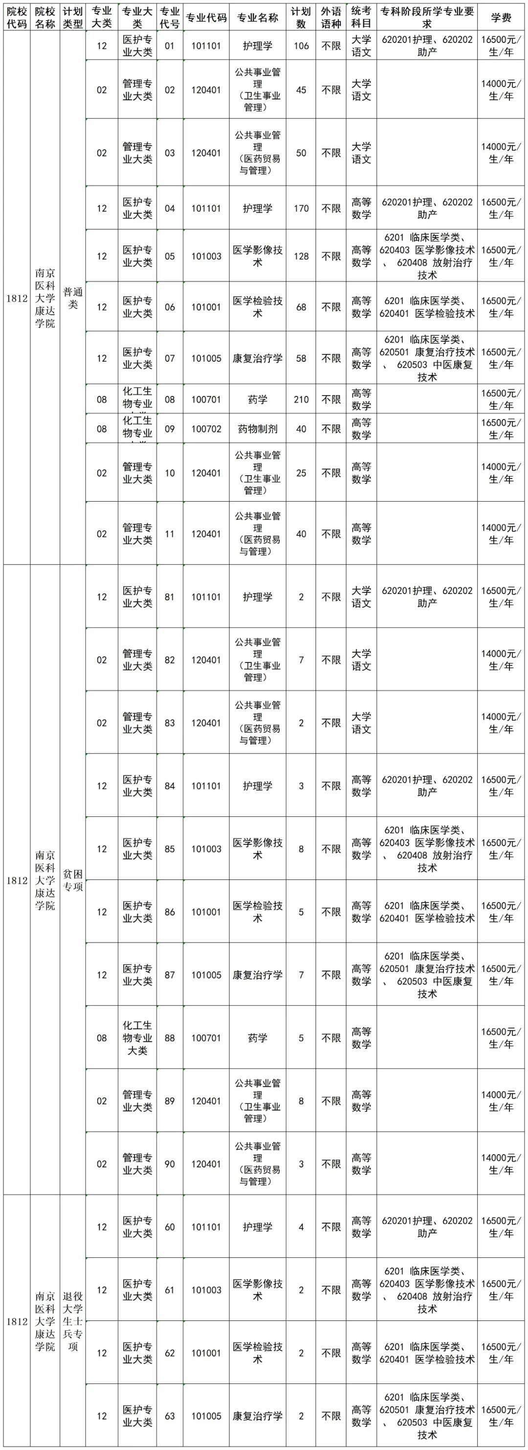 根据省教育厅相关文件精神,南京医科大学康达学院2022年招收高职(专科)“专转本”学生1000人,招生专业与计划安排如下: