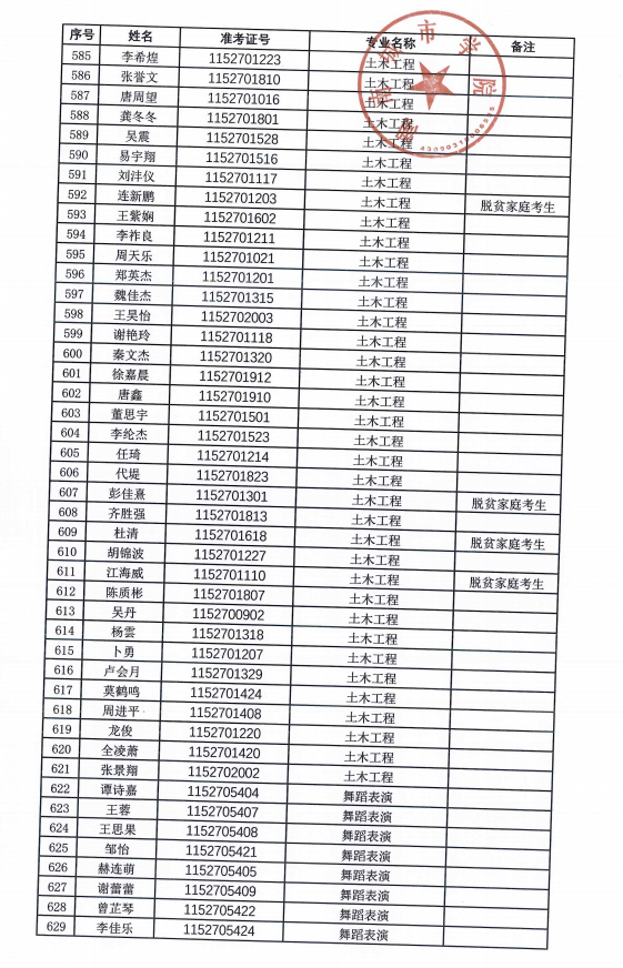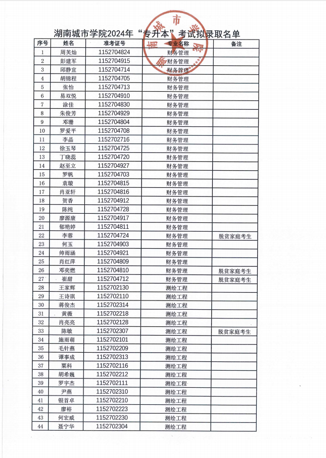 根据湖南省教育厅《关于做好我省2024年普通高等学校专升本考试招生工作的通知》(湘教发〔2023〕50号)、《关于做好我省2024年普通高等学校专升本考试招生工作实施工作的通知》(湘教考成字〔2024〕2号)及《湖南城市学院2024年专升本招生章程》,经过我校专升本领导小组审核,并按程序上报湖南省教育考试院审定,现将674名拟录取学生名单予以公示(具体名单见附件)。