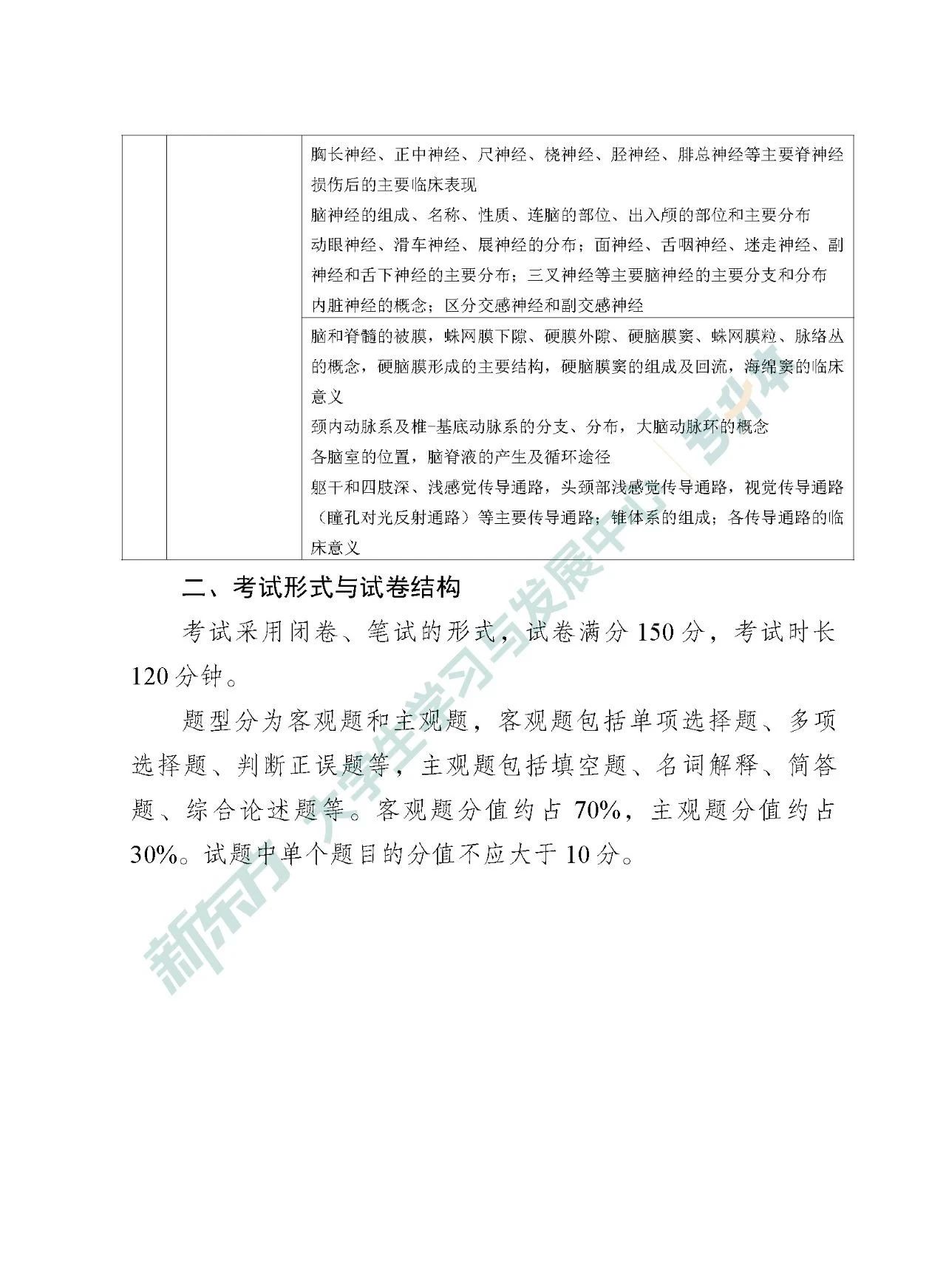 《人体解剖学》考试内容主要包括:绪论,运动系统,内脏学,内分泌系统,感觉器官,脉管系统,神经系统。满分150分,题型分为客观题和主观题,客观题分值约占70%,主观题分值约占30%。试题中单个题目的分值不应大于10分。客观题包括单项选择题、多项选择题、判断正误题等,主观题包括填空题、名词解释、简答题、综合论述题等。