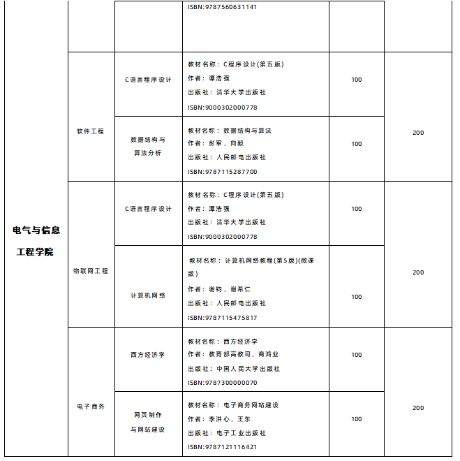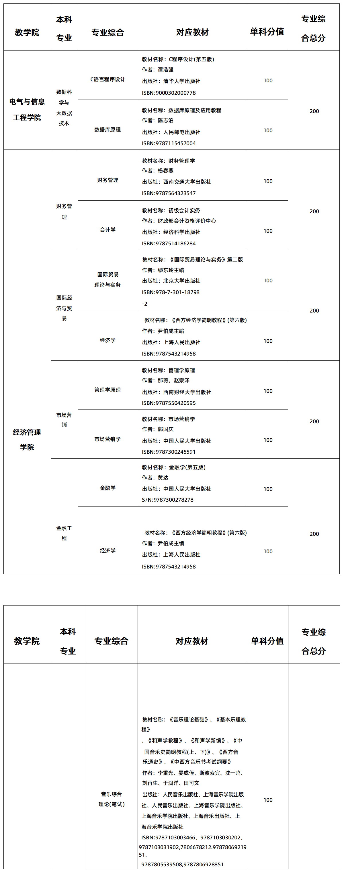 2025年湖南统招专升本考试科目由公共科目和专业综合科目组成。 各专业总分满分 500 分,公共科二科满分分别为150分,共300分: 专业综合满分200 分。公共科目共设大学语文、高等数学、大学英语 3 门,根据专业人才培养要求从中任选2门,专业综合科目只设1 门专业综合科目。2025年湖南交通工程学院共有30个招生专业,各专业考试参考教材详见下表:
