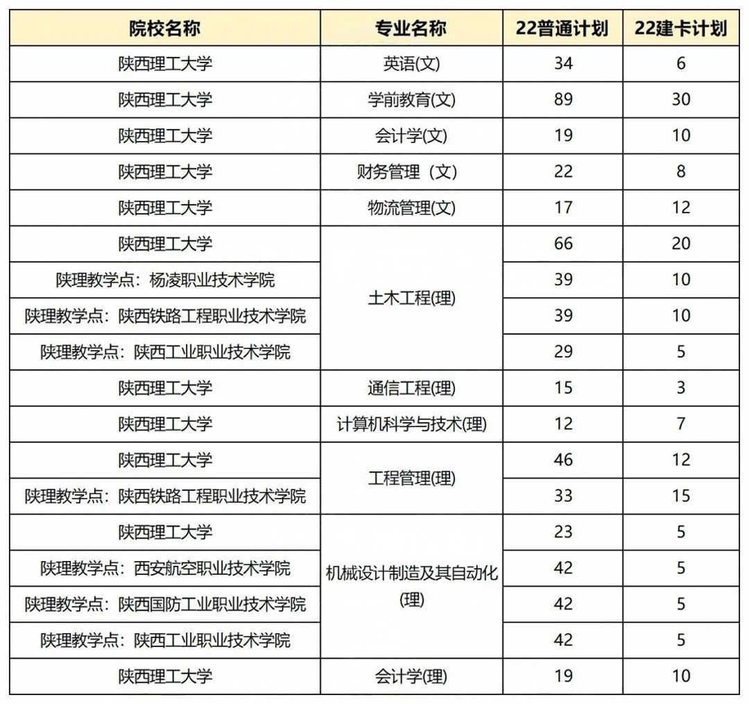 2022年到2024年陕西理工大学专升本各专业招生计划