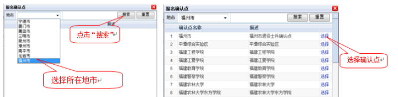 查询报名地区后,选择报名确认点,请参看下图,选择报名确认点,选择所在城市→点击“搜索”按钮→报名确认点,点击“选择”,即可;若选错城市可以点击“重置”按钮进行重置,再进行选择检索操作。