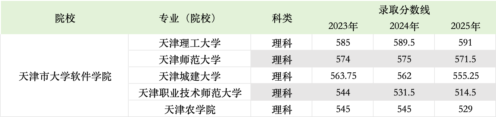 天软整体分数线呈下降趋势(天津理工大学呈上升趋势)。
