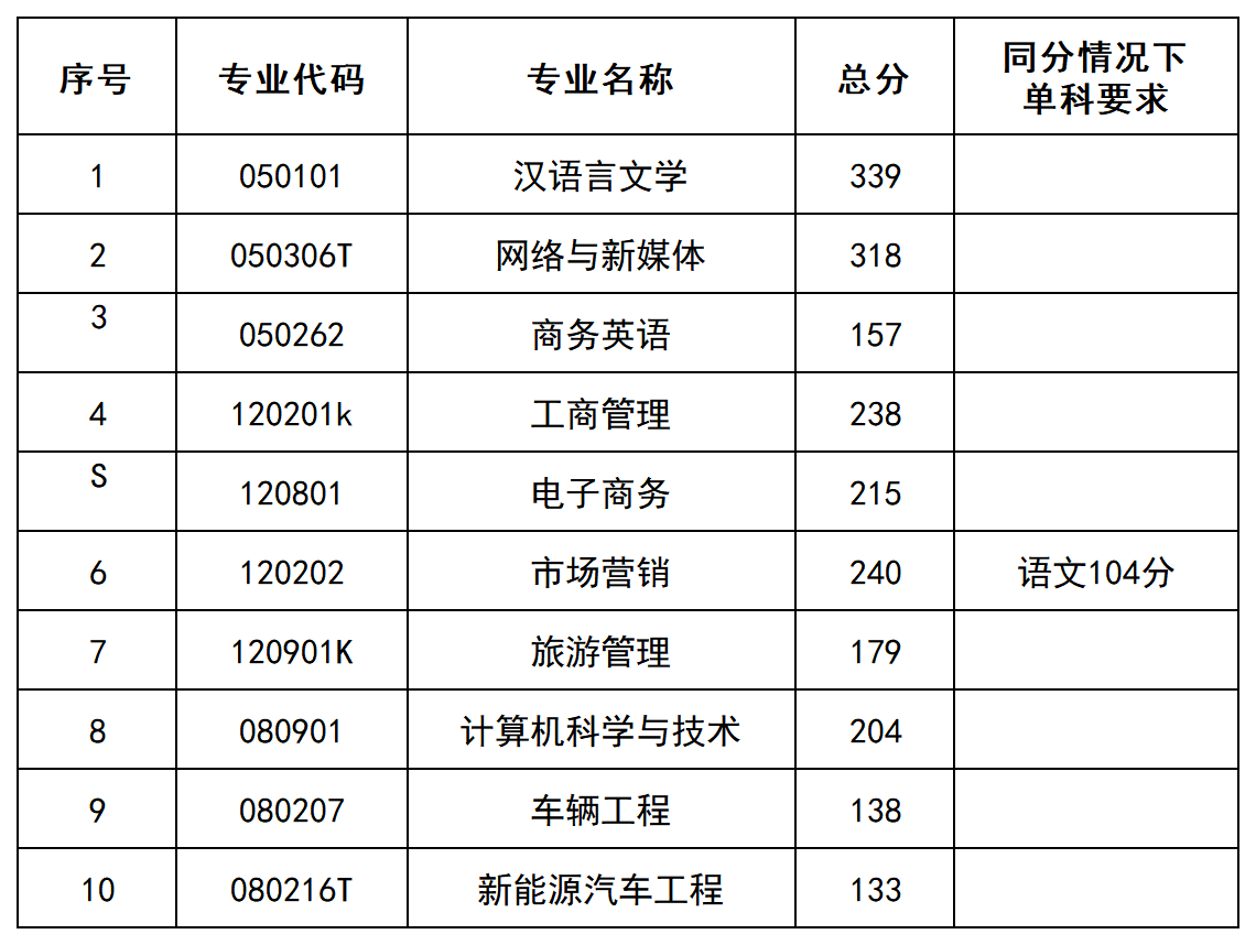 2.总分相同考生按大学语文、高等数学、大学英语、专业综合科目的先后顺序,从高分到低分排位。