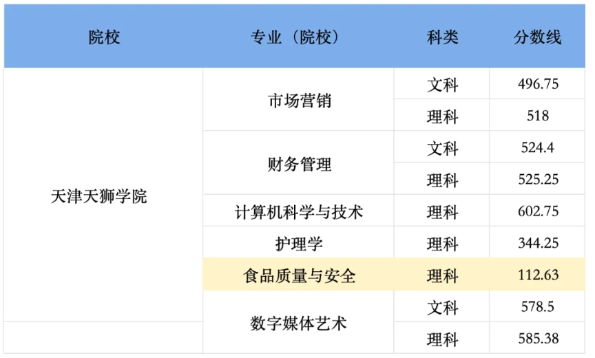 天津天狮学院最低录取分数112.63分,为理科类的食品质量与安全专业!