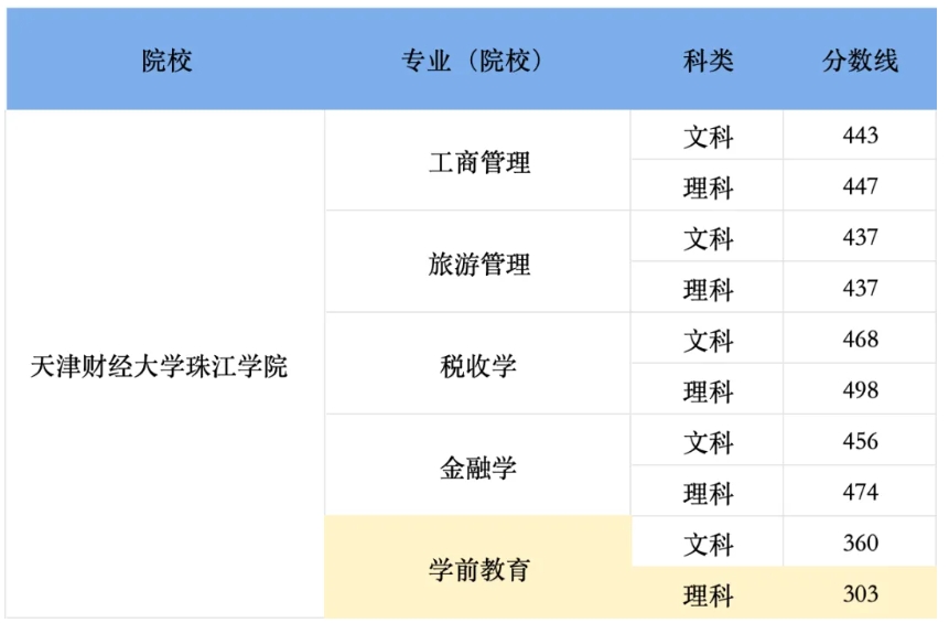 天津财经大学珠江学院最低录取分数是303分,为理科类的学前教育专业!