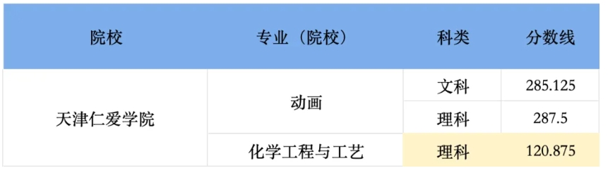 天津仁爱学院最低录取分数120.875分,为理科类的化学工程与工艺专业!