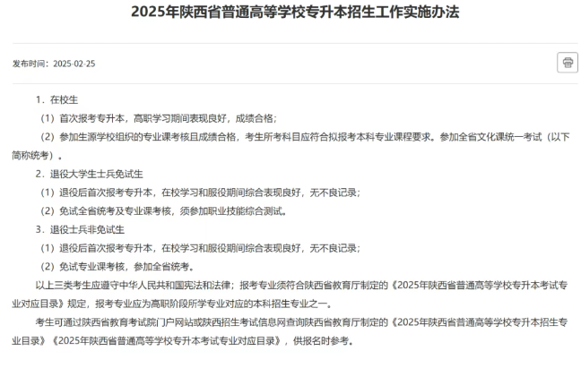 以上三类考生应遵守中华人民共和国宪法和法律;报考专业须符合陕西省教育厅制定的《2025年陕西省普通高等学校专升本考试专业对应目录》规定,报考专业应为高职阶段所学专业对应的本科招生专业之一。