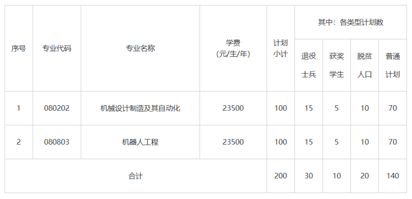 注:联合培养专业:机械设计制造及其自动化和机器人工程专业,联合培养院校:共青科技职业学院,培养地点:江西省共青城市。