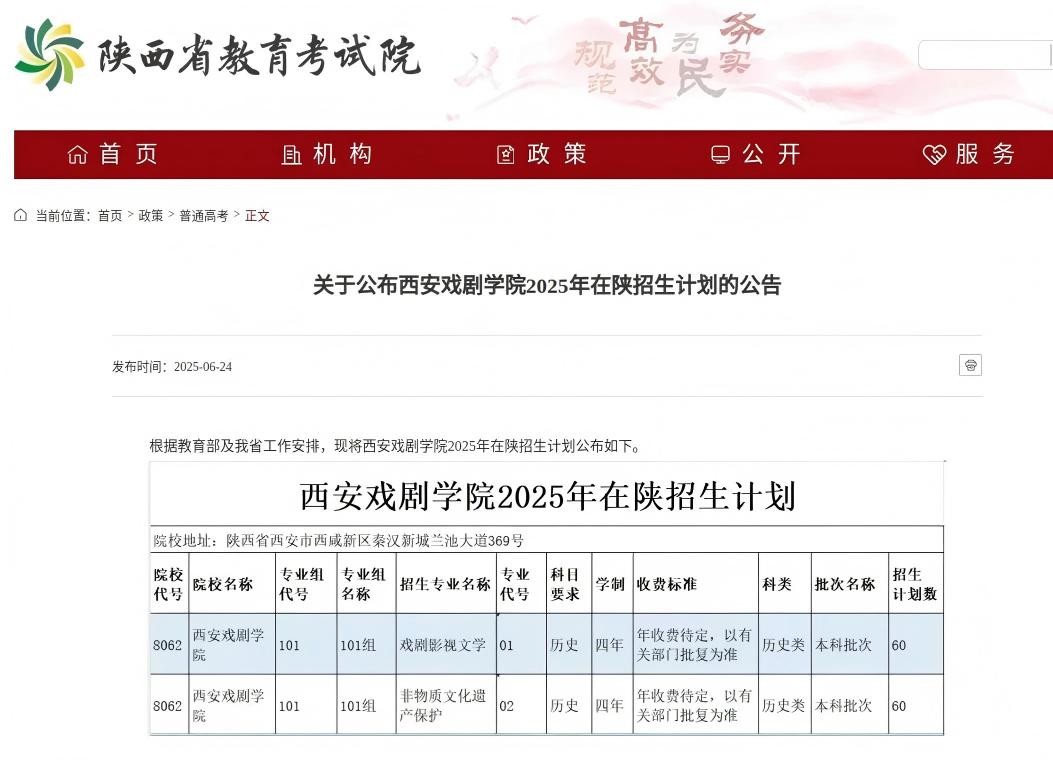 6月24日陕西省教育考试院发布《关于公布西安戏剧学院2025年在陕招生计划的公告》戏剧影视文学非物质文化遗产保护两个专业共计划收120名本科生。