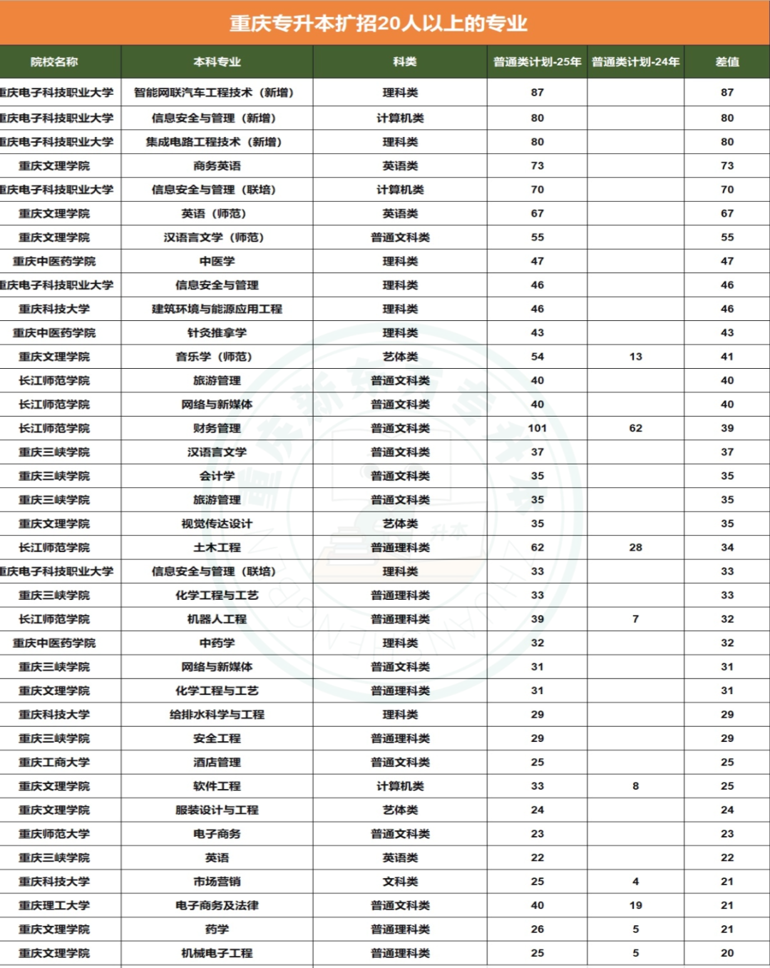 2025年重庆专升本扩招名单新鲜出炉,扩招20人以上的专业共37个,不少专业名额增幅亮眼,想报考的同学快收好这份攻略~