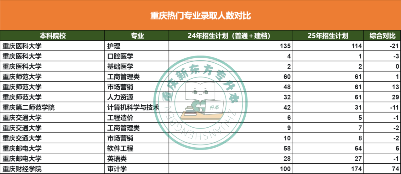 根据以上热门专业排行,小编整理了重庆一部分学校的热门专业计划招生录取人数对比,26/27专升本的同学可以参考一下哦~