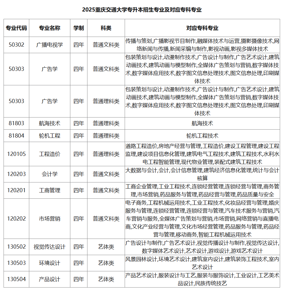 2026重庆交通大学专升本有专业限制的,广播电视学专升本限制专科专业为传播与策划,广播影视节目制作,融媒体技术与运营,摄影摄像技术等,广告学限制专科专业为包装策划与设计,动漫制作技术,广告设计与制作,广告艺术设计等,工程造价限制专科专业为道路工程造价,房地产经营与管理,工程造价,建设工程管理,建设工程监理等。参考25年重庆交通大学专升本专业招生要求。
