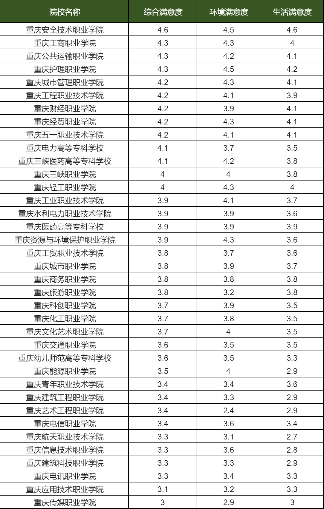 这份满意度排行可为广大考生及家长了解重庆各专科院校提供参考,也为各院校提升办学质量提供了方向。如果你想了解更多院校信息,可持续关注我们的官网更新。