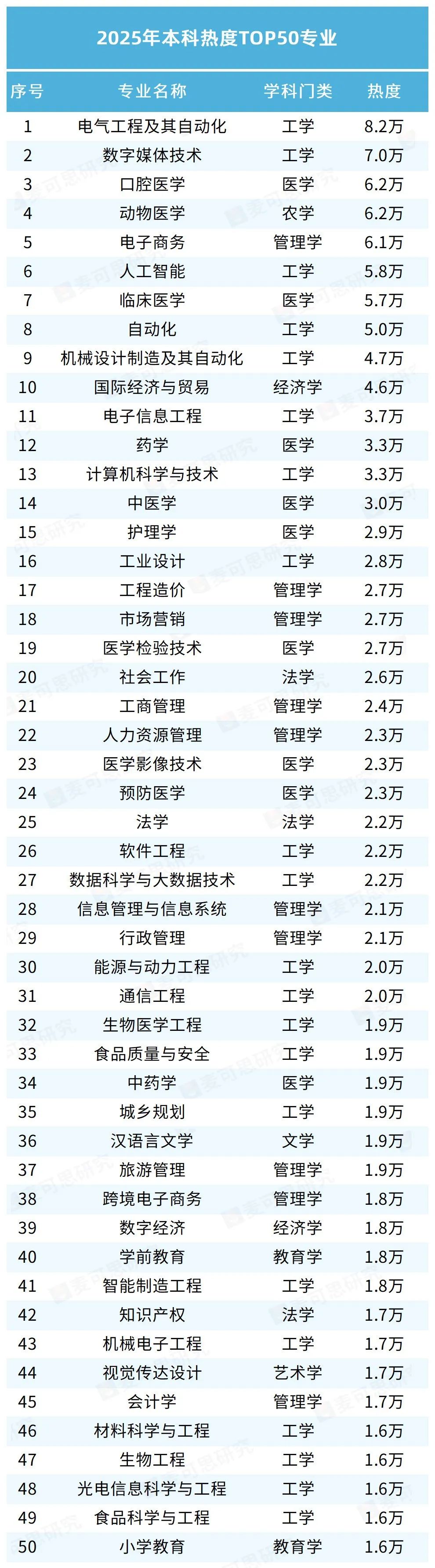 电气工程及其自动化登顶,数字媒体技术、人工智能等工学专业排在榜单前10.这背后,是新能源、智能制造、互联网行业的蓬勃刚需。电网升级、短视频爆发、AI渗透各领域,这让工学专业成为技术浪潮的“弄潮儿”。
