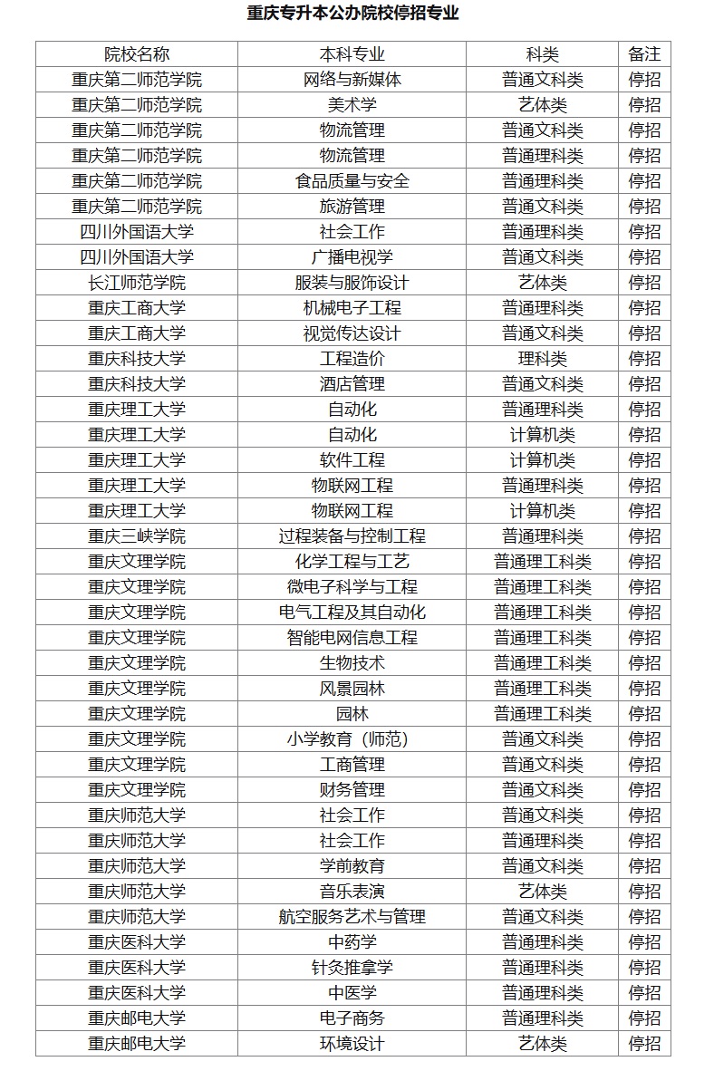 2025年重庆专升本公办院校中重庆第二师范学院停招网络与新媒体、美术学、物流管理专业,重庆工商大学停招视觉传达设计、机械电子工程专业。详细数据参考下表。