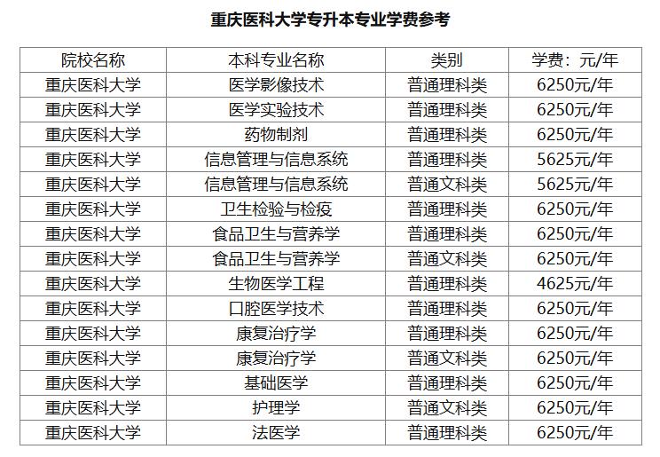 重庆医科大学专升本专业的学费在5000-7000元左右,不算贵。口腔医学技术、康复治疗学(普通理科类及普通文科类)、基础医学、法医学,学费均为6250元/年。参考2025年的学费标准。