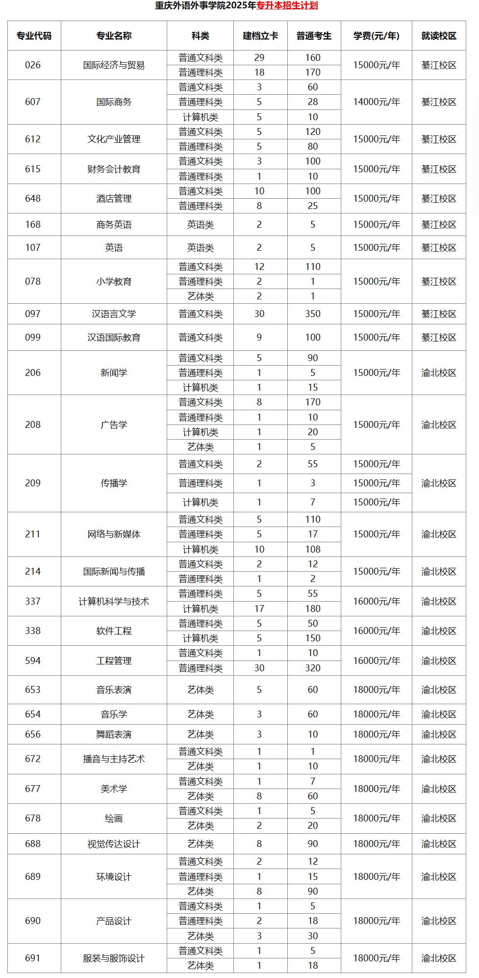 重庆外语外事学院2025年专升本普通和建档立卡计划总计招生3656人,其中国际经济与贸易专业文理科共计招生330人,计算机科学与技术专业共招生235人。详细数据参考下表。