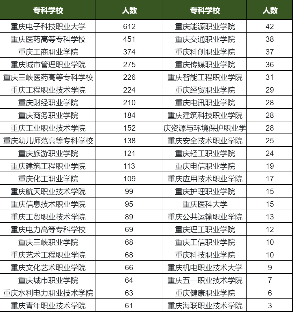 2025年上岸人数较少的有重庆机电职业技术大学9人,重庆五一职业技术学院7人,重庆健康职业学院6人,重庆海联职业技术学院3人。数据内容仅供参考。