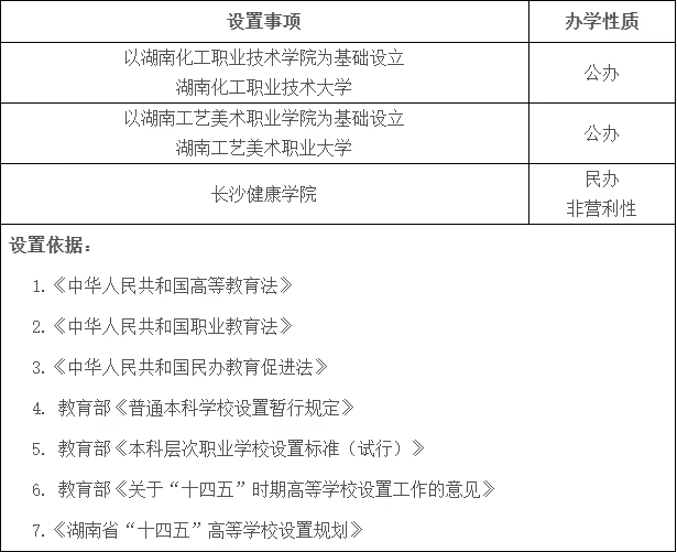湖南省教育厅公示,根据《湖南省“十四五”高等学校设置规划》,经省第四届高等学校设置评议委员会专家组现场考察、集体评议,现将拟设置湖南化工职业技术大学、湖南工艺美术职业大学、长沙健康学院予以公示。公示时间为2025年9月5日至2025年9月11日。