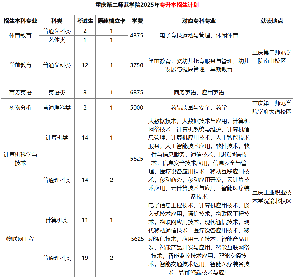 重庆第二师范学院2025年专升本招生总数为94人,其中物联网工程计划招生33人,计算机科学与技术计划招生31人,学前教育计划招生13人。