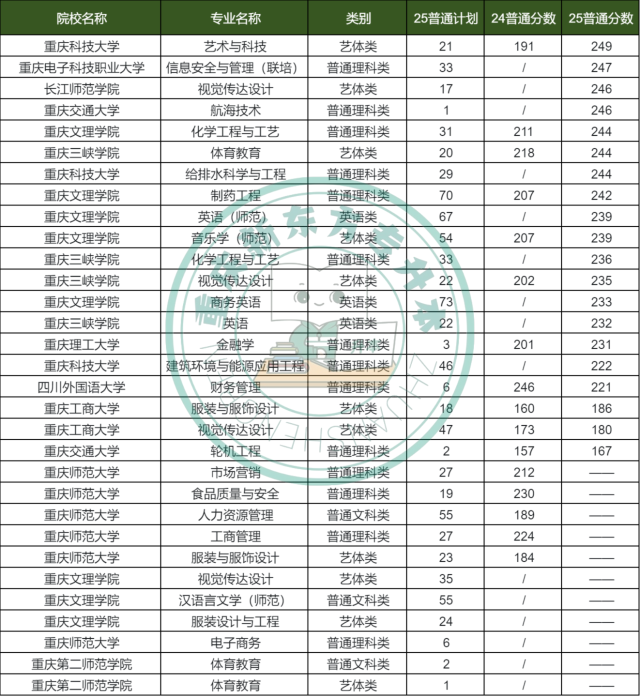 25年重庆专升本低于250分的院校+专业共20个。从专业上看:这个梯队理科类专业数量最多,其次是艺体类、英语类。