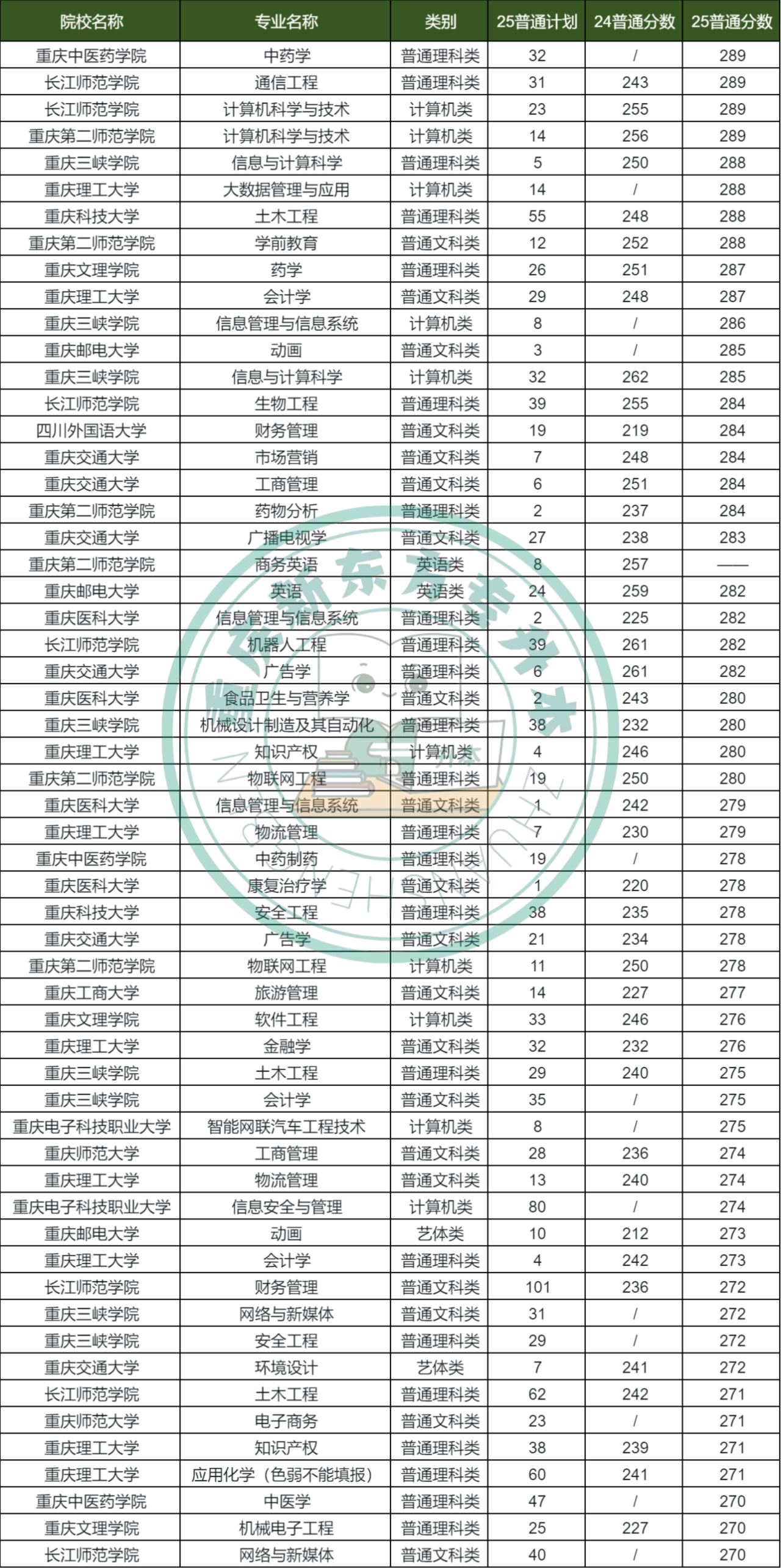 25年重庆专升本270-290分的院校+专业共56个,是四个梯队中院校专业数量最多的,重庆专升本公办分数线也大多集中在这个范围从专业上看:依然绝大部分都是理科类专业和计算机类专业,不过此梯队开始也有文科类以及其他类专业加入。