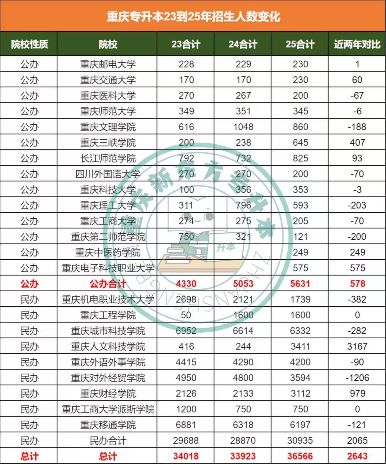 今年公办新增了两所本科院校,整体是呈扩招趋势,目前重庆专升本招生计划数的变化总体呈现先扩后缩趋势,特别是公办院校的竞争情况日渐激烈。