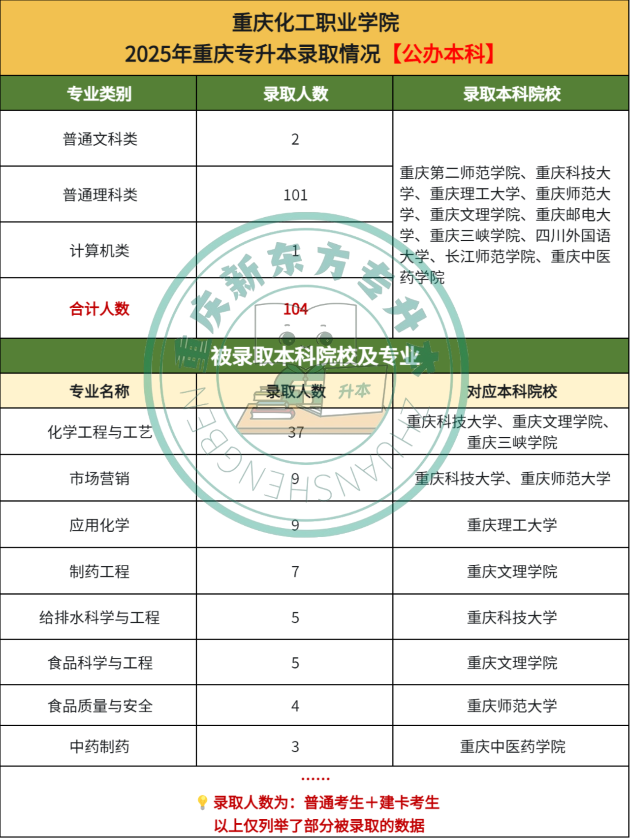 在2025年重庆市普通高校专升本考试中,根据各公办本科院校的录取公示名单来看,有10所公办本科录取了重庆化工职业学院的同学,合104人