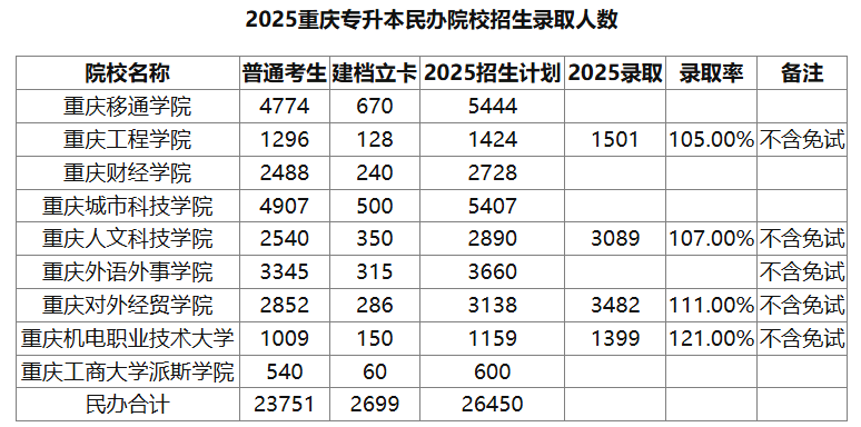 重庆专升本民办院校中2025年重庆人文科技学院招生增加2742人,重庆对外经贸学院减少1202人。重庆移通学院、重庆城市科技学院、重庆外语外事学院、重庆机电职业技术大学也有计划人数减少的情况;重庆财经学院、重庆工程学院计划合计有小幅度增加,重庆工商大学派斯学院无变化。