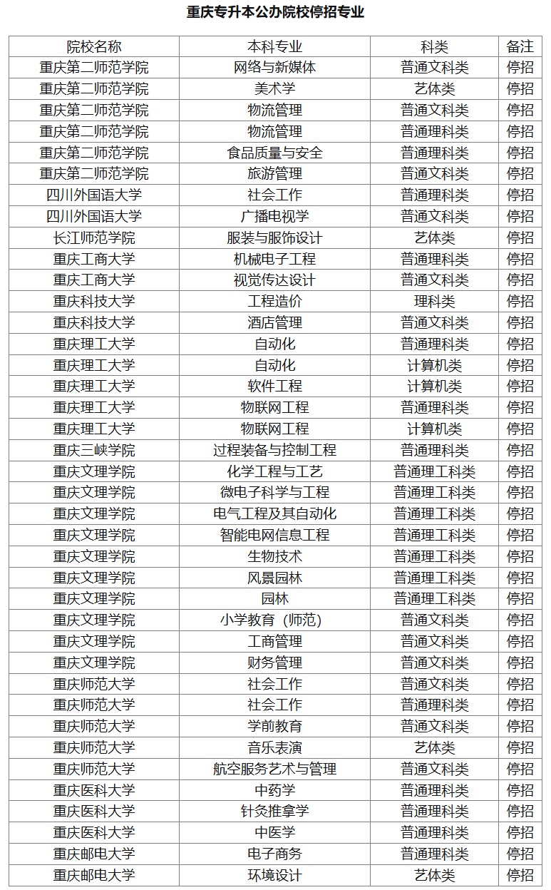 2025年重庆专升本公办院校中重庆第二师范学院停招网络与新媒体、美术学、物流管理专业,重庆工商大学停招视觉传达设计、机械电子工程专业。详细数据参考下表。