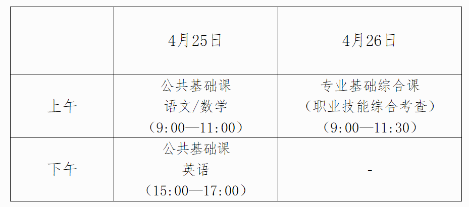 1.普通考生。考试科目分为公共基础课和专业基础综合课(见附件6),总分600分。其中,公共基础课考2门(语文或数学,英语),每门满分150分,每门考试时间120分钟;专业基础综合课(根据专业类别采用2门或3门专业基础课合卷)考1门,满分300分,考试时间150分钟。具备免专业基础综合课考试资格的普通考生只需参加公共基础课考试。