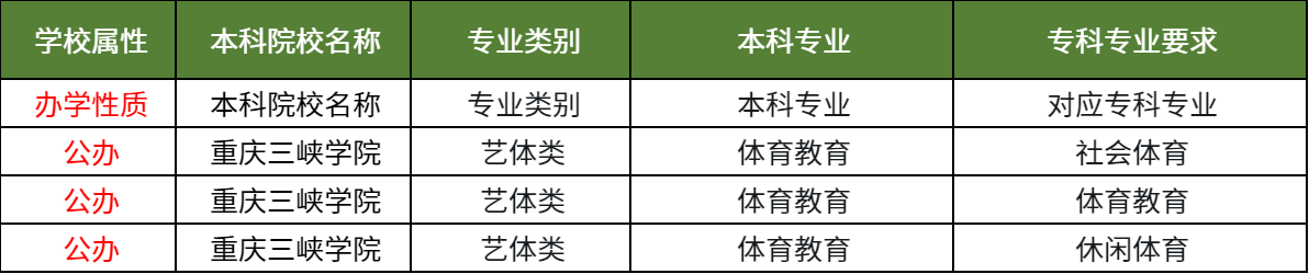 以下是2025年重庆专升本考试,重庆三峡学院的体育教育专业招生的一览表,供大家参考。