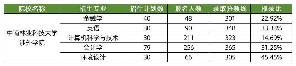 2025年中南林业科技大学涉外学院专升本共5个专业,招生计划数共209人,各专业具体报录比汇总如下: