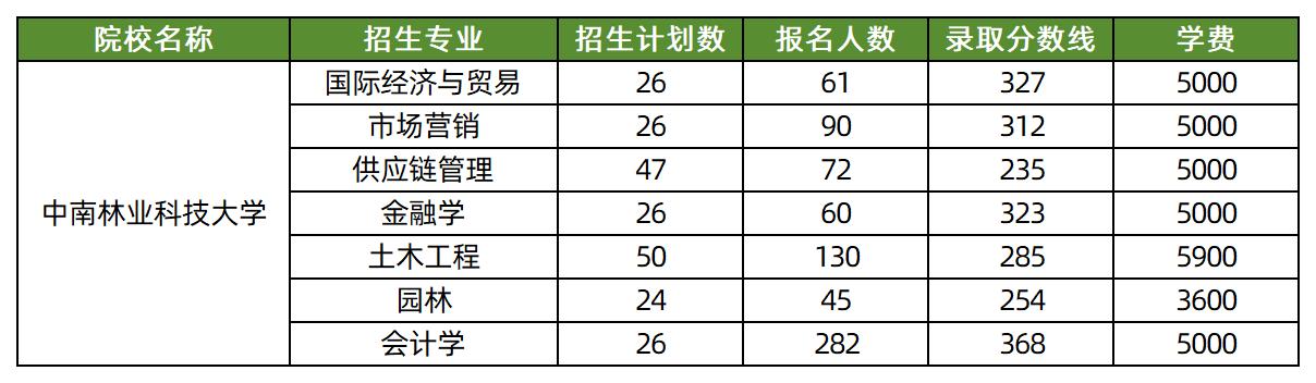 2025年中南林业科技大学专升本共7个专业,招生计划数共225人,各专业具体招录情况汇总如下: