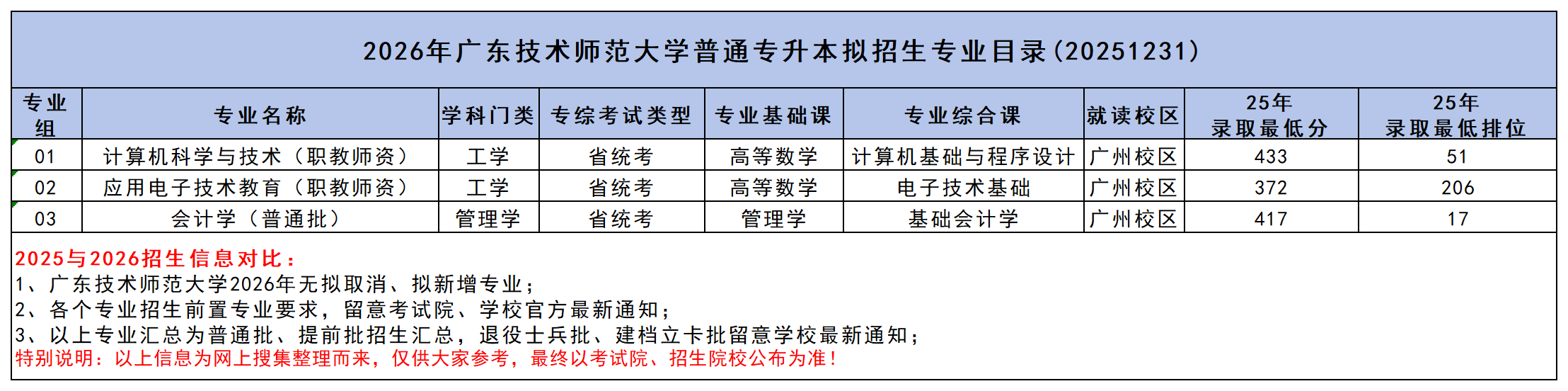 2026 年广东专升本公办院校招生动态继续更新!本次为大家带来广东技术师范大学 2026 年普通专升本拟招生专业目录。