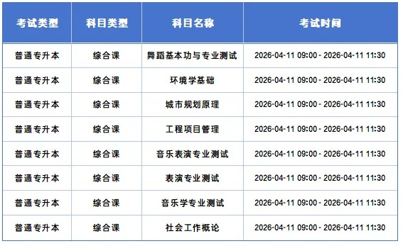 (四)普通专升本招生考试时间为2026年3月28日(星期六)至29日(星期日)两天,具体安排见下表: