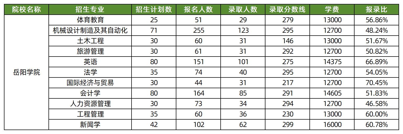 2025年岳阳学院专升本共11个专业,录取人数603人,录取分数线最高299分、最低146分,各专业具体招录情况汇总如下: