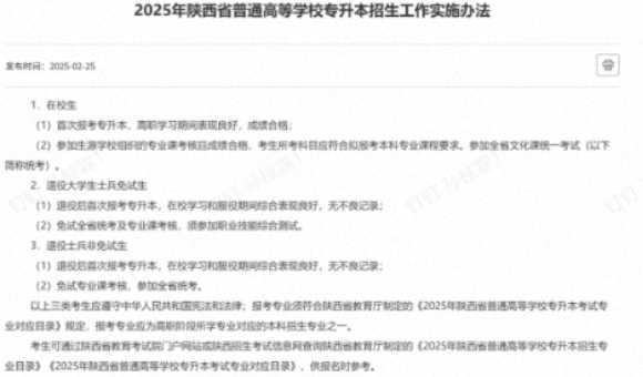 以上三类考生应遵守中华人民共和国宪法和法律;报考专业须符合陕西省教育厅制定的《2025年陕西省普通高等学校专升本考试专业对应目录》规定,报考专业应为高职阶段所学专业对应的本科招生专业之一。
