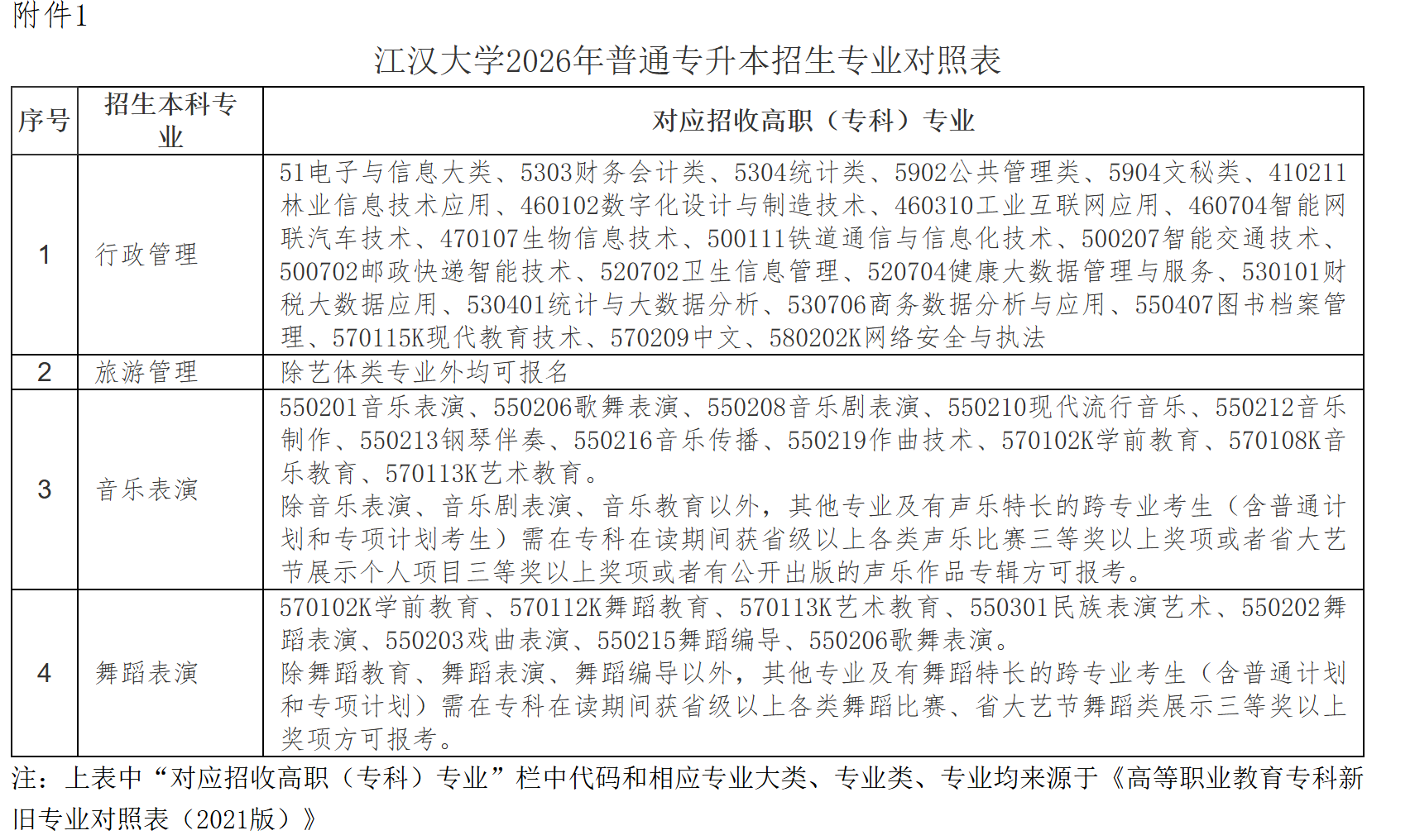 注:上表中“对应招收高职(专科)专业”栏中代码和相应专业大类、专业类、专业均来源于《高等职业教育专科新旧专业对照表(2021版)》