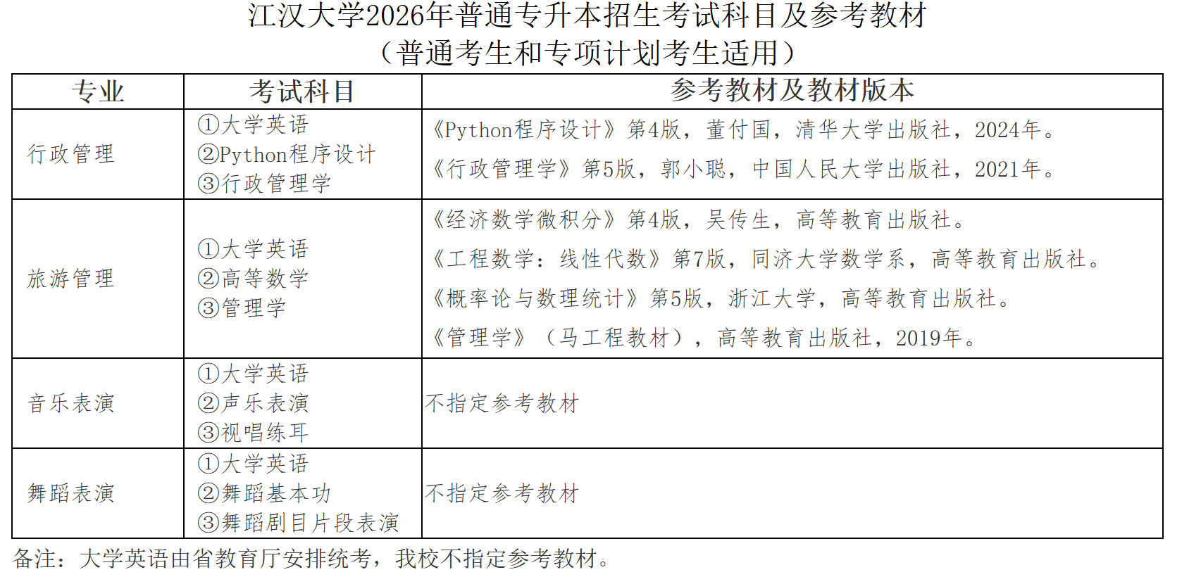 2.江汉大学2026年普通专升本招生考试科目及参考教材