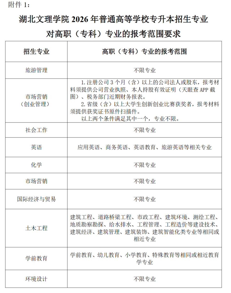 附件1:湖北文理学院2026年普通高等学校专升本招生专业对高职(专科)专业的报考范围要求