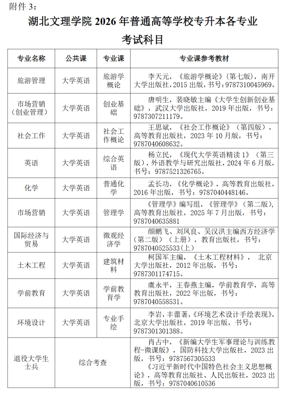 附件3:湖北文理学院2026年普通高等学校专升本各专业考试科目
