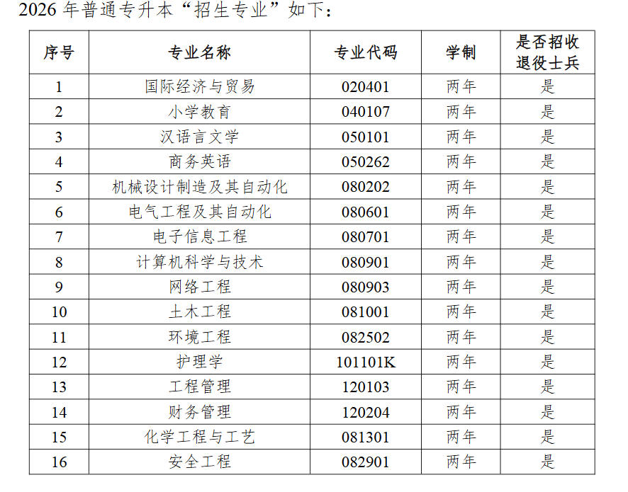 根据《2026年湖北省高校普通专升本分专业招生计划》安排,我校2026年普通专升本“招生专业”如下: