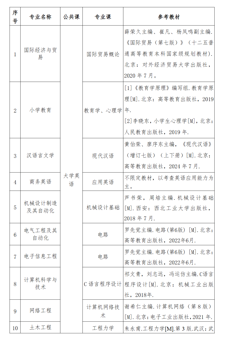 1. 普通考生及专项计划考生考试科目为2门:一门公共课和一门专业课。公共课《大学英语》总分100分,考试时长120分钟;专业课总分150分,考试时长120分钟,具体要求见官网发布的课程考试大纲(见附件4)。