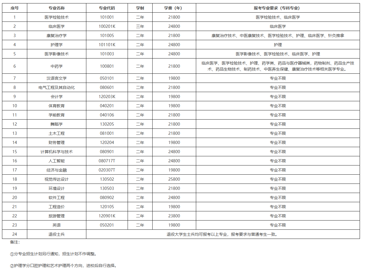 专升本学生(含退役大学生士兵)为我校普通全日制学生,除临床医学为3年制外,其余均为2年制。不得采取非全日制学习形式就读,入学后不得转专业和转学。