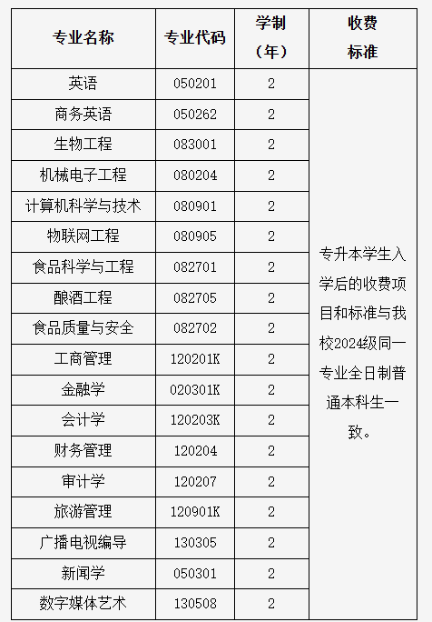 被我校录取的2026年普通专升本学生,入学后的学费、住宿费等收费项目和标准与我校2024级同一专业全日制普通本科生一致。