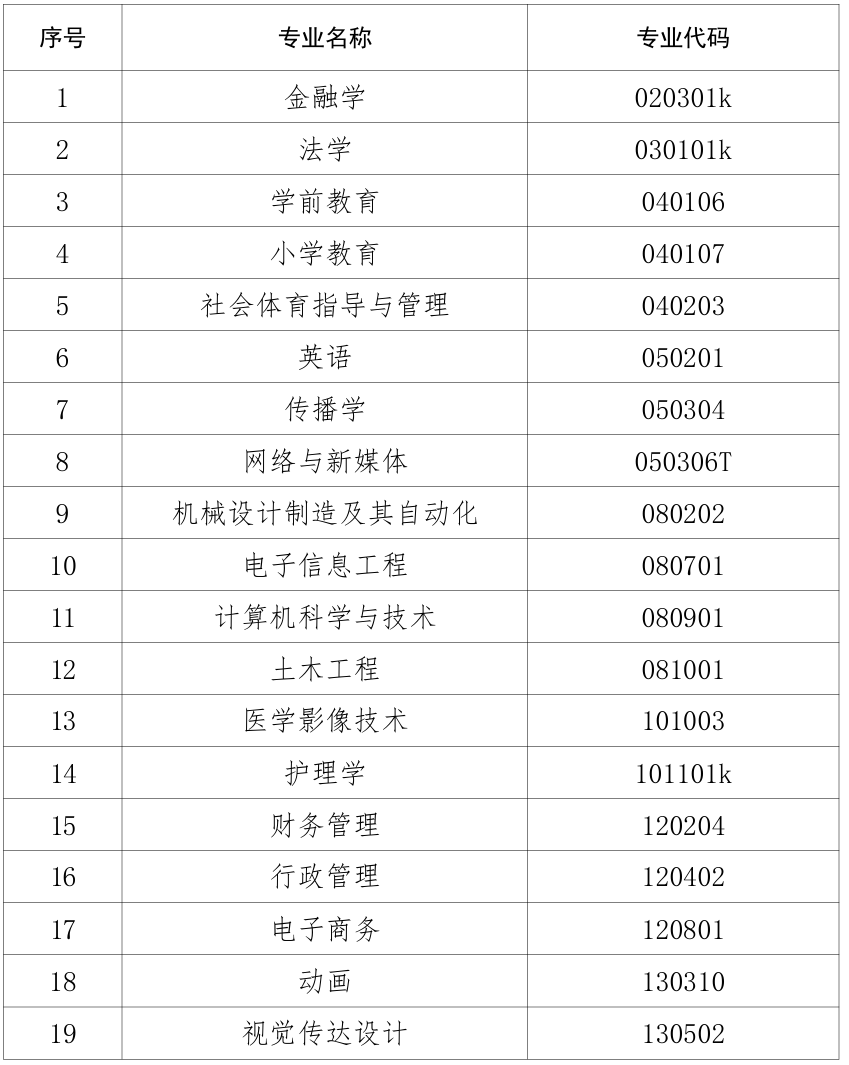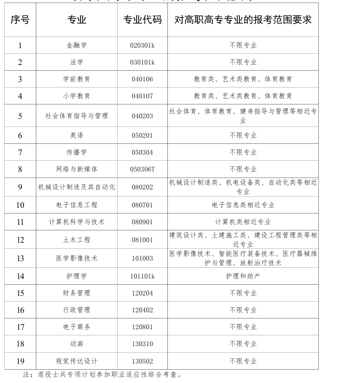 分专业招生计划另行通知,以上19个专业退伍大学生士兵均可报考。当我校某专业报考人数不足,招生计划出现空余时,后续将按相关程序进行补录。